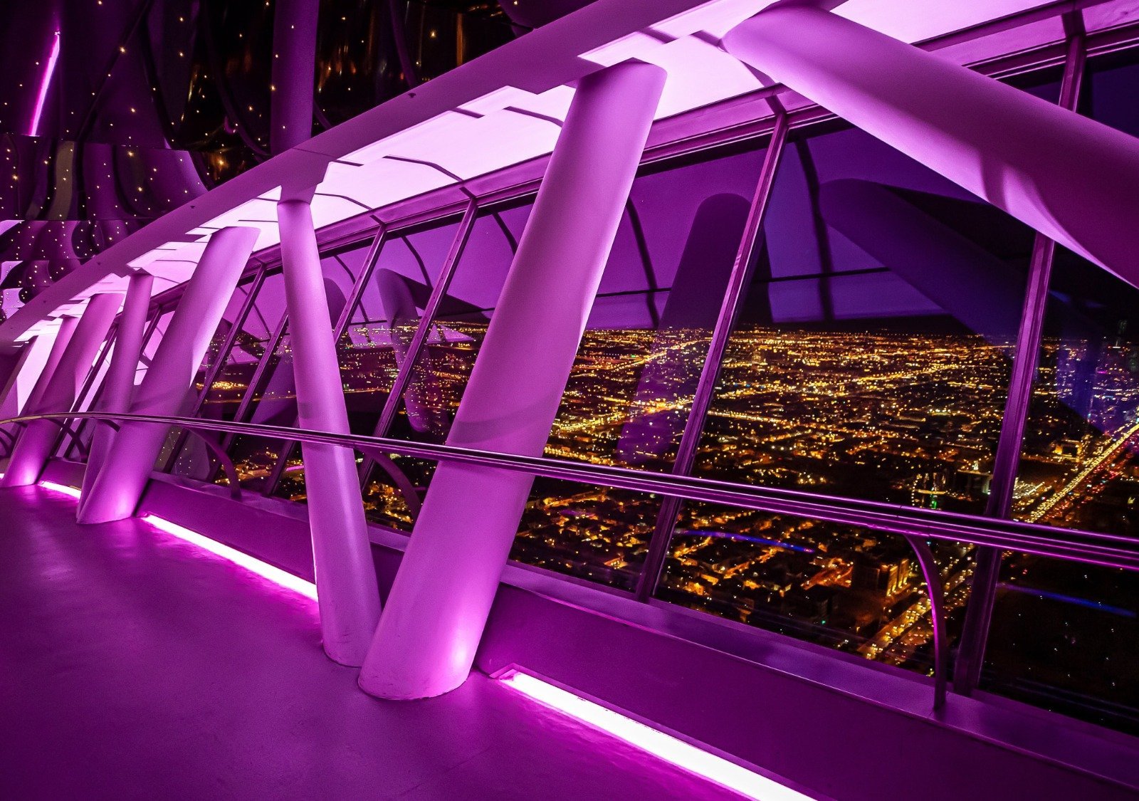 From a height of 300 meters in the sky of Riyadh, take in a stunning panoramic view of the beauty of the city through highly secure glass panels. These panels let you enjoy the view of the starry nights and contemplate the yellow lights reflected on the streets and buildings of Riyadh from the Sky Bridge. Another way to seize the moment is by taking selfies where the glamour of the city behind you on a clear day.